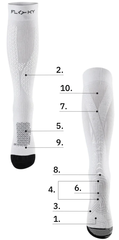 JUMPER is the first biomechanical sock designed for activities where jumping is predominant, such as basketball, volleyball and handball. It provides improved support for all biomechanical functions related to the foot and muscular thrust, allowing protection from injury and wear, reducing vibrations that can generate micro-rush and inflammation, and supporting the technical gesture during thrust. S M L XL |