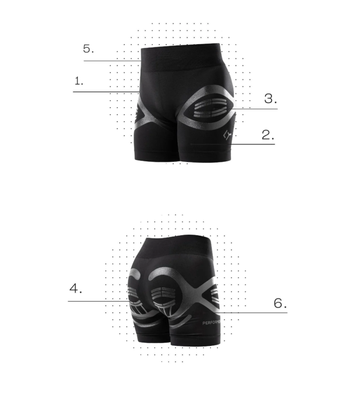 PERFORMER WOMAN is the first biomechanical short designed to provide targeted support to the pelvic area, glutes, and lower back, enhancing muscle balance and stability during sports activities. Thanks to graduated compression and strategically placed silicone applications, PERFORMER promotes circulation, reduces muscle vibrations, and speeds up recovery, delivering lightness, protection, and confidence even during the most intense efforts. Main benefits: